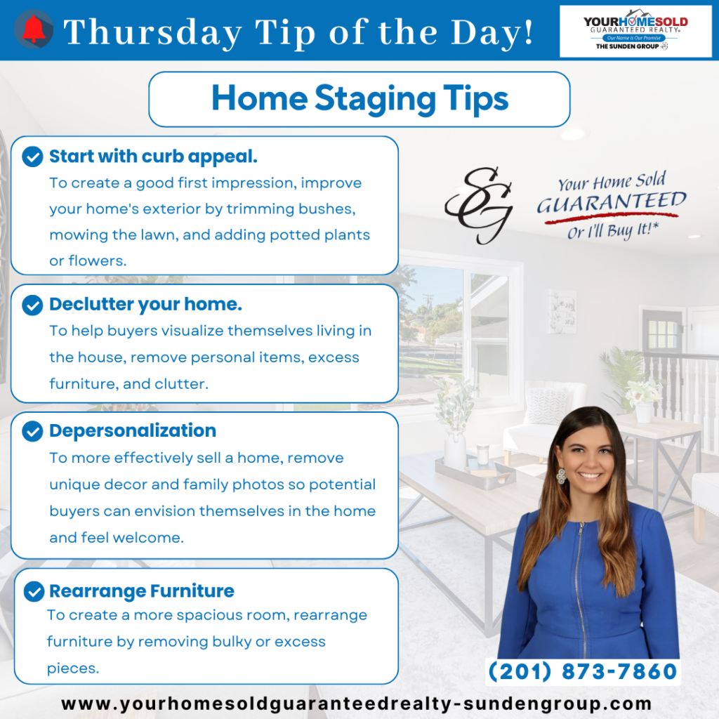 At The Sunden Group, we offer personalized guidance and expert advice to make your home shine. Contact us at 201-739-6443 for complimentary services and exclusive insights into the real estate market. Our website, Your Home Sold Guaranteed Realty – Sunden Group, is packed with valuable resources and listings waiting for your exploration!